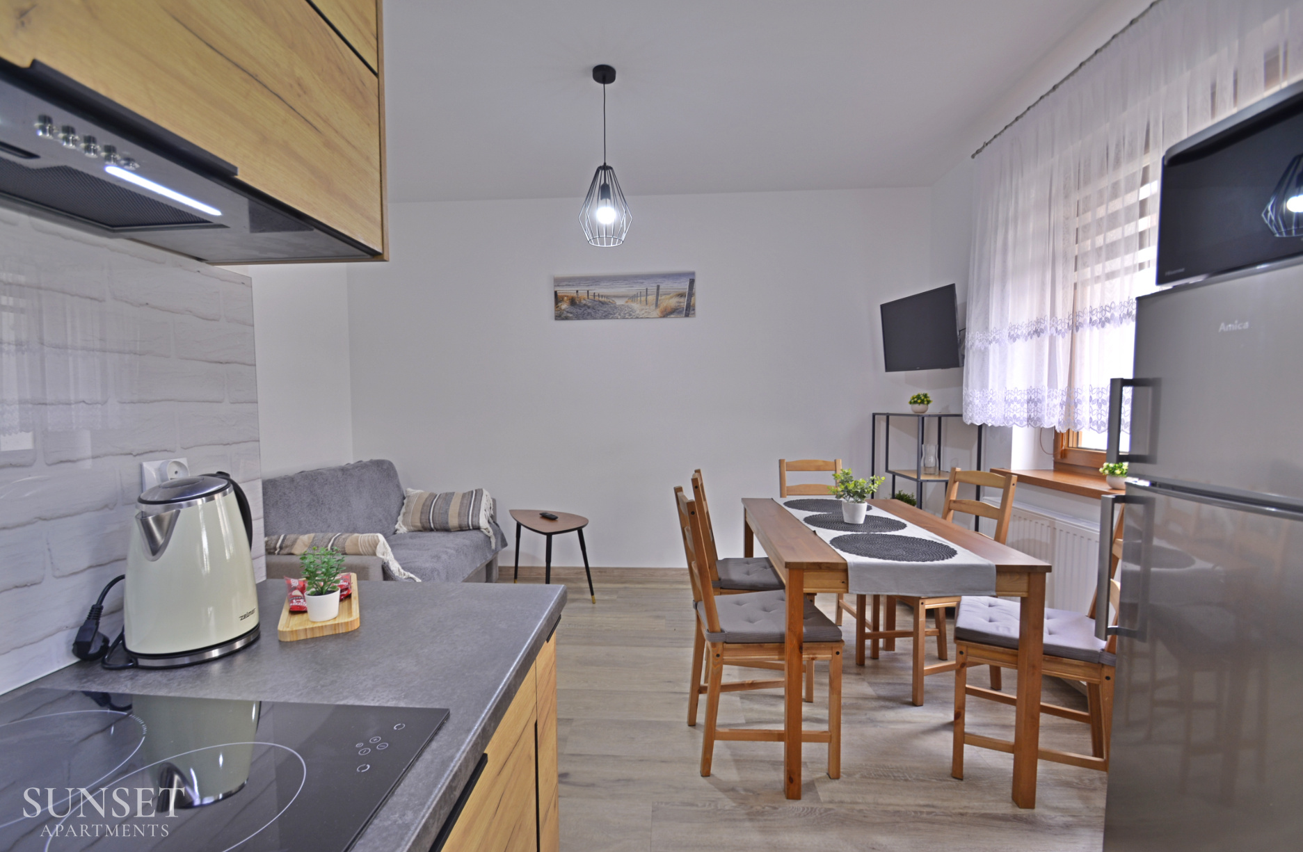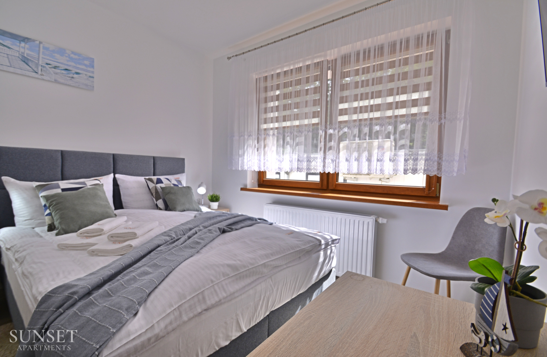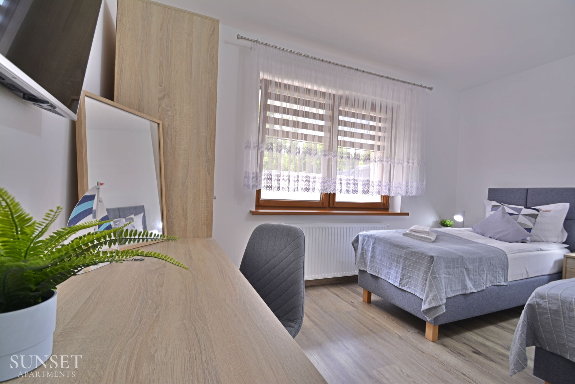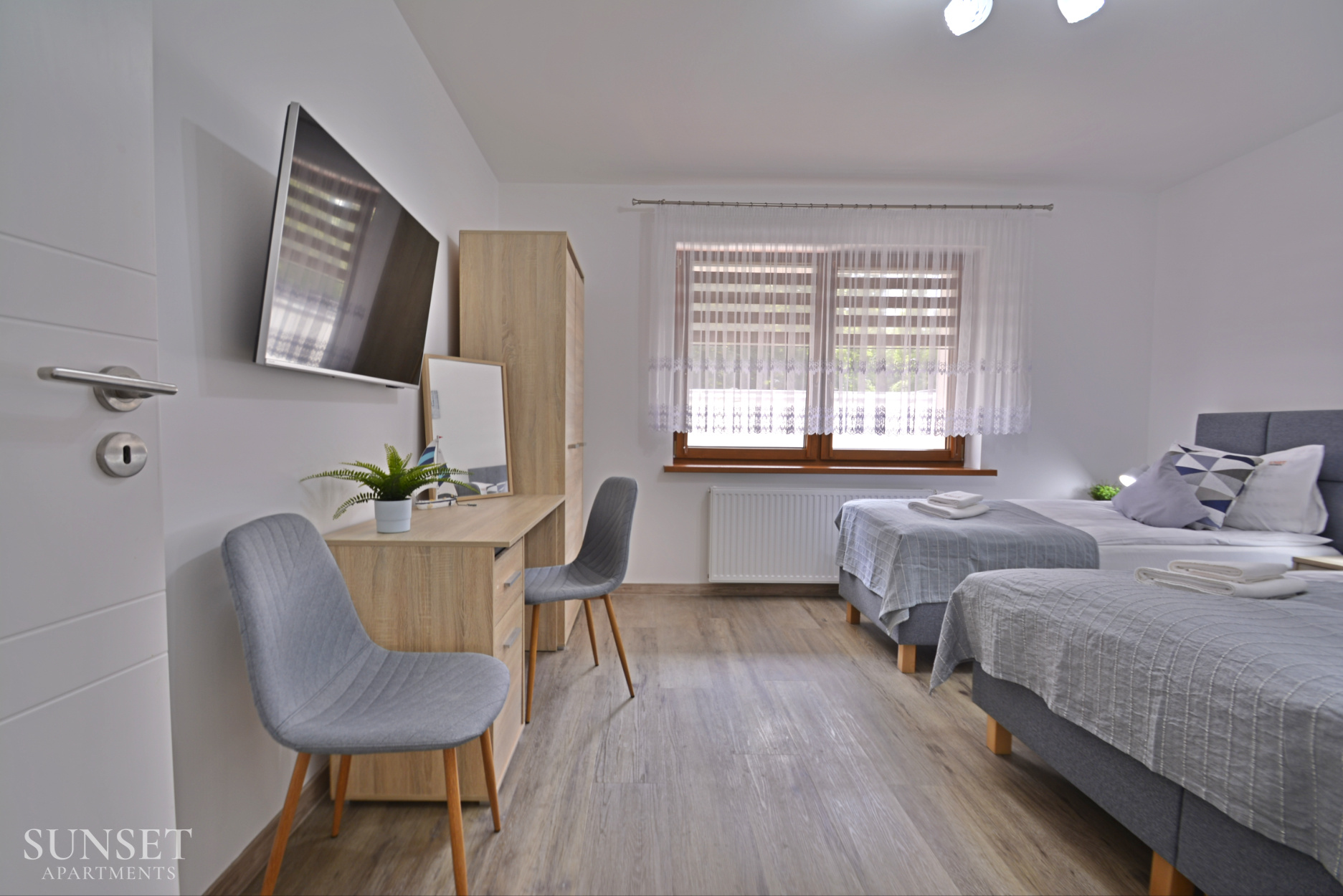 Das Apartment Nr. 2 ist ein ideales Angebot für Familien, ausgelegt für einen Aufenthalt von maximal 5 Personen. Die geräumige Wohnung besteht aus zwei separaten Schlafzimmern. Die bequemen Doppelbetten sind 160 cm breit. Das Wohnzimmer ist mit der Küchenzeile verbunden. Das Badezimmer ist mit einer Waschmaschine ausgestattet, die Ihren Aufenthalt noch angenehmer macht. In jedem Schlafzimmer gibt es einen Fernseher. Ein Parkplatz ist im Angebot nicht enthalten.