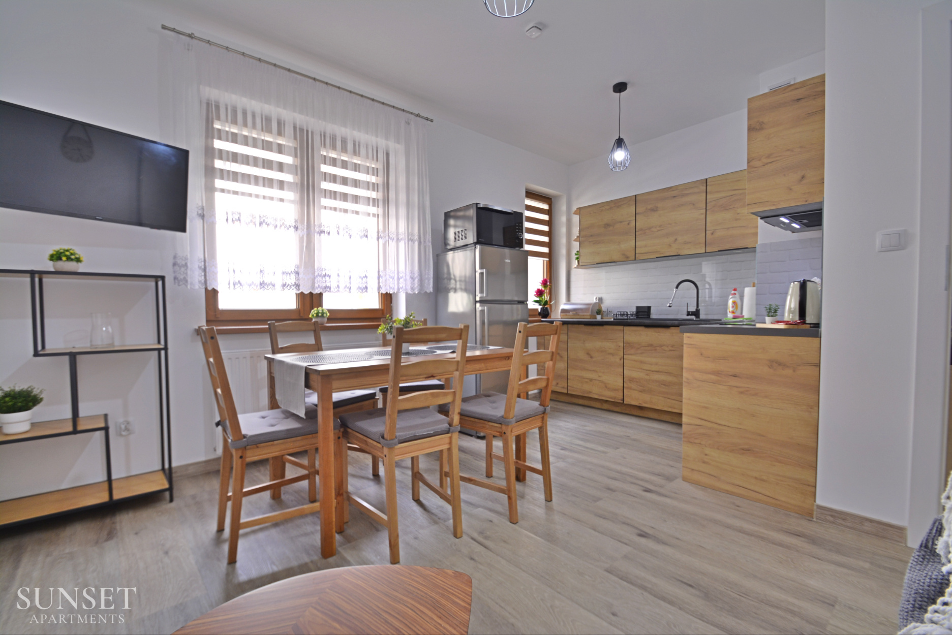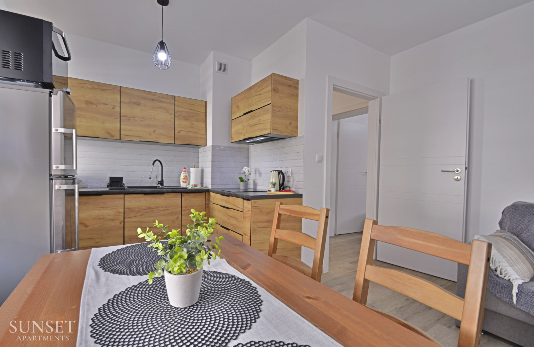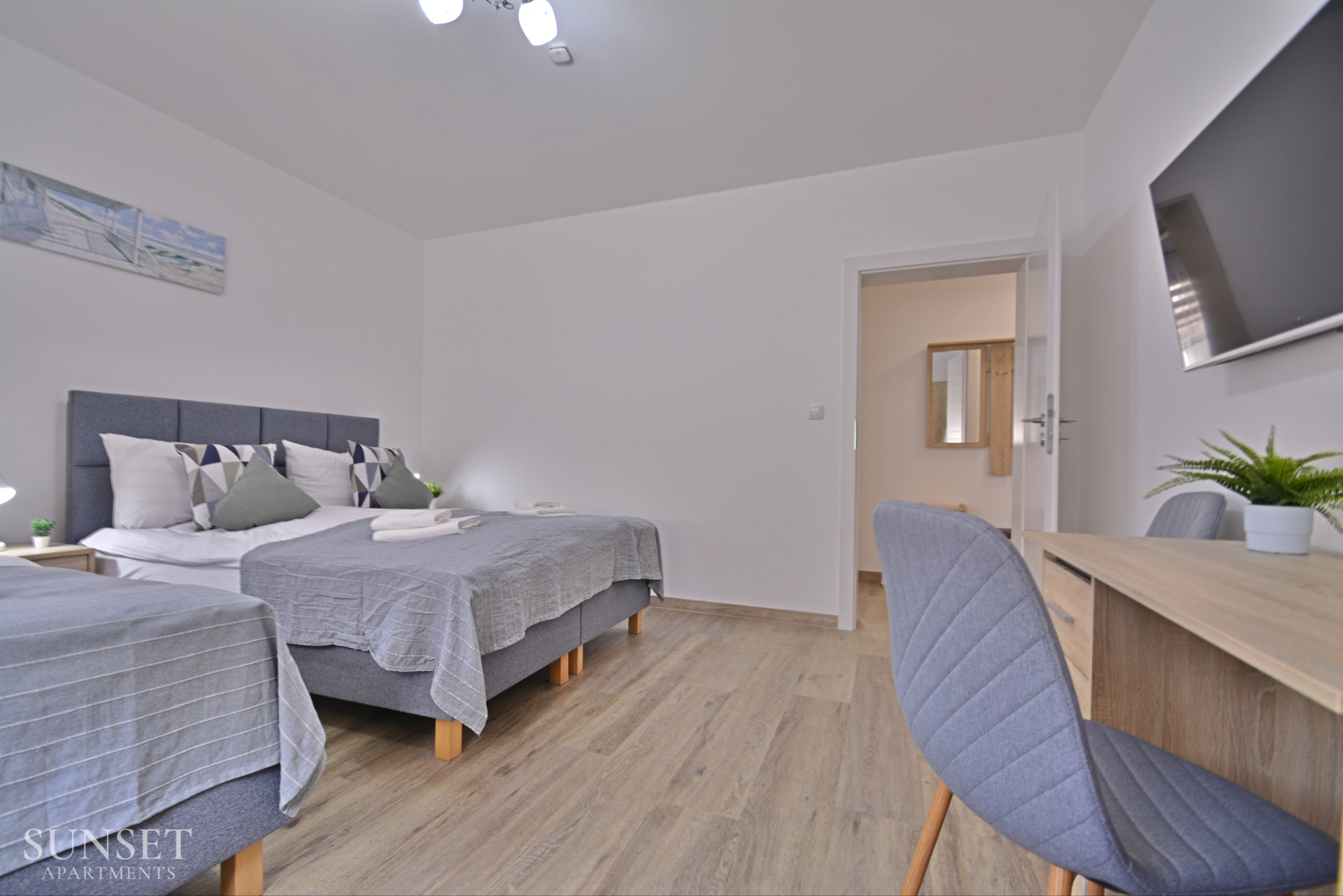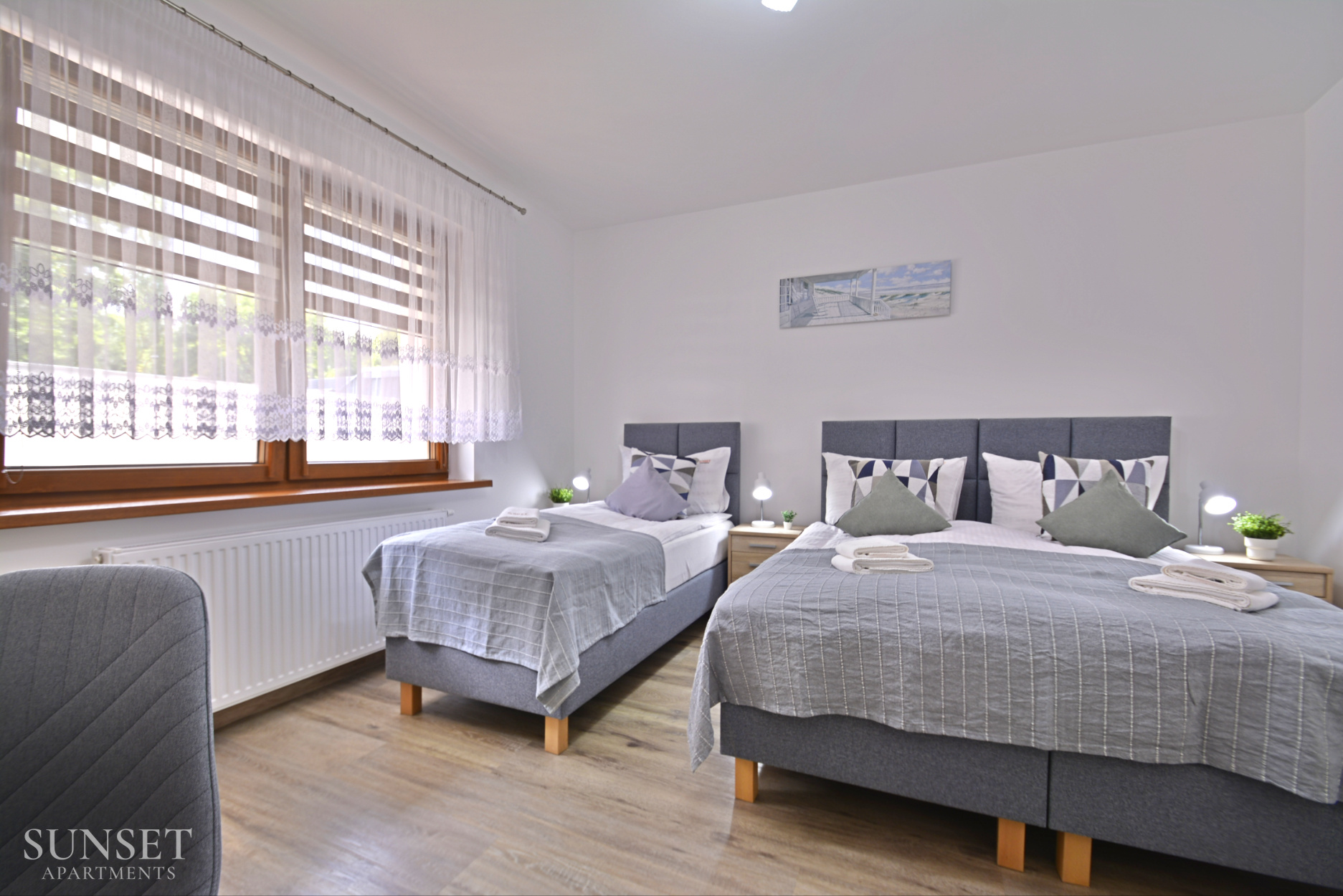 Das Apartment Nr. 2 ist ein ideales Angebot für Familien, ausgelegt für einen Aufenthalt von maximal 5 Personen. Die geräumige Wohnung besteht aus zwei separaten Schlafzimmern. Die bequemen Doppelbetten sind 160 cm breit. Das Wohnzimmer ist mit der Küchenzeile verbunden. Das Badezimmer ist mit einer Waschmaschine ausgestattet, die Ihren Aufenthalt noch angenehmer macht. In jedem Schlafzimmer gibt es einen Fernseher. Ein Parkplatz ist im Angebot nicht enthalten.