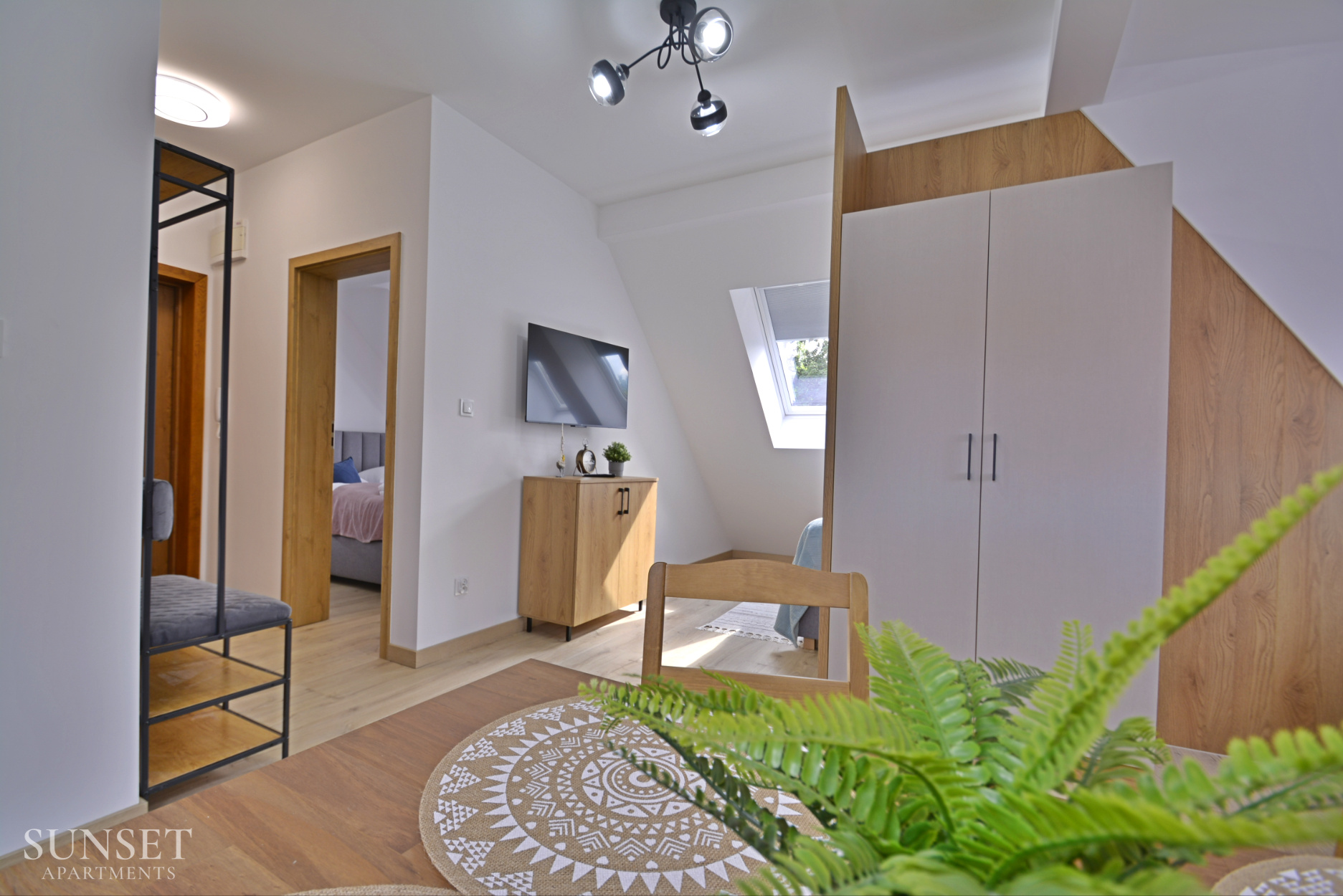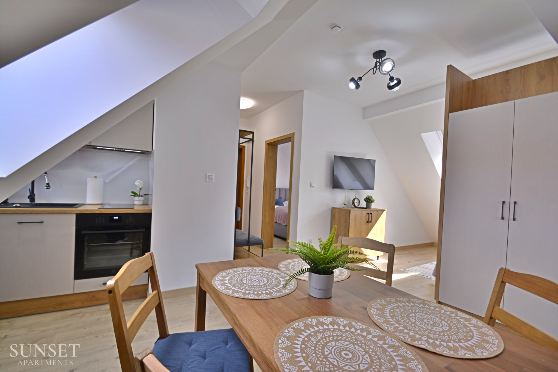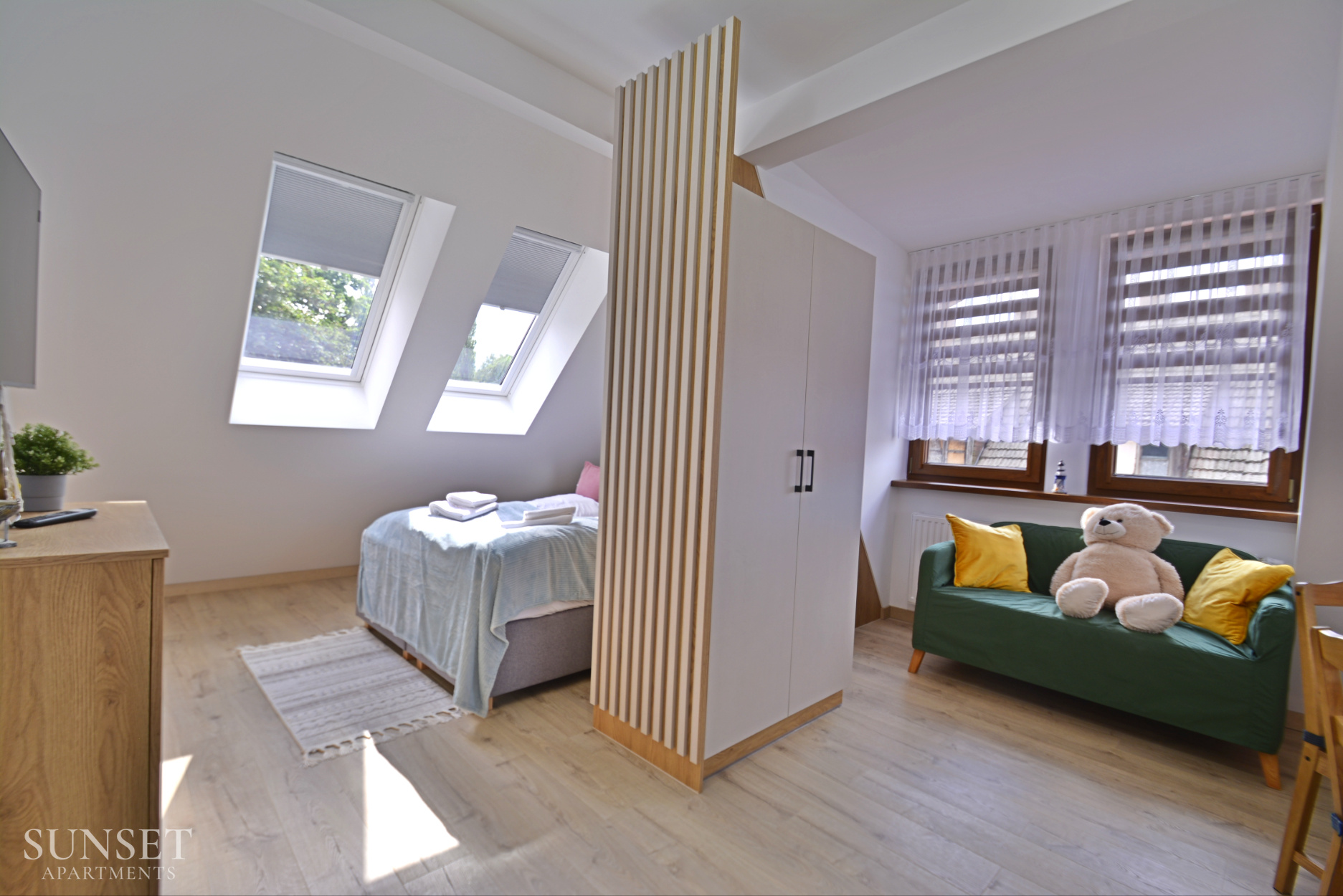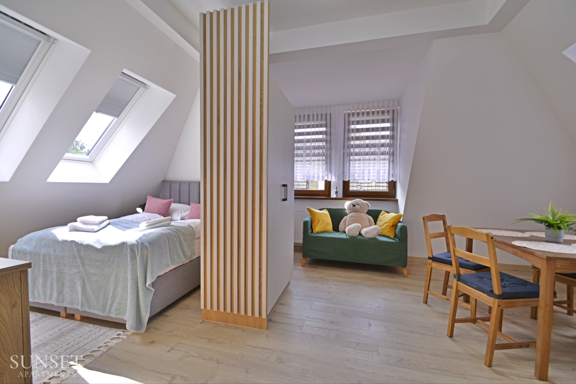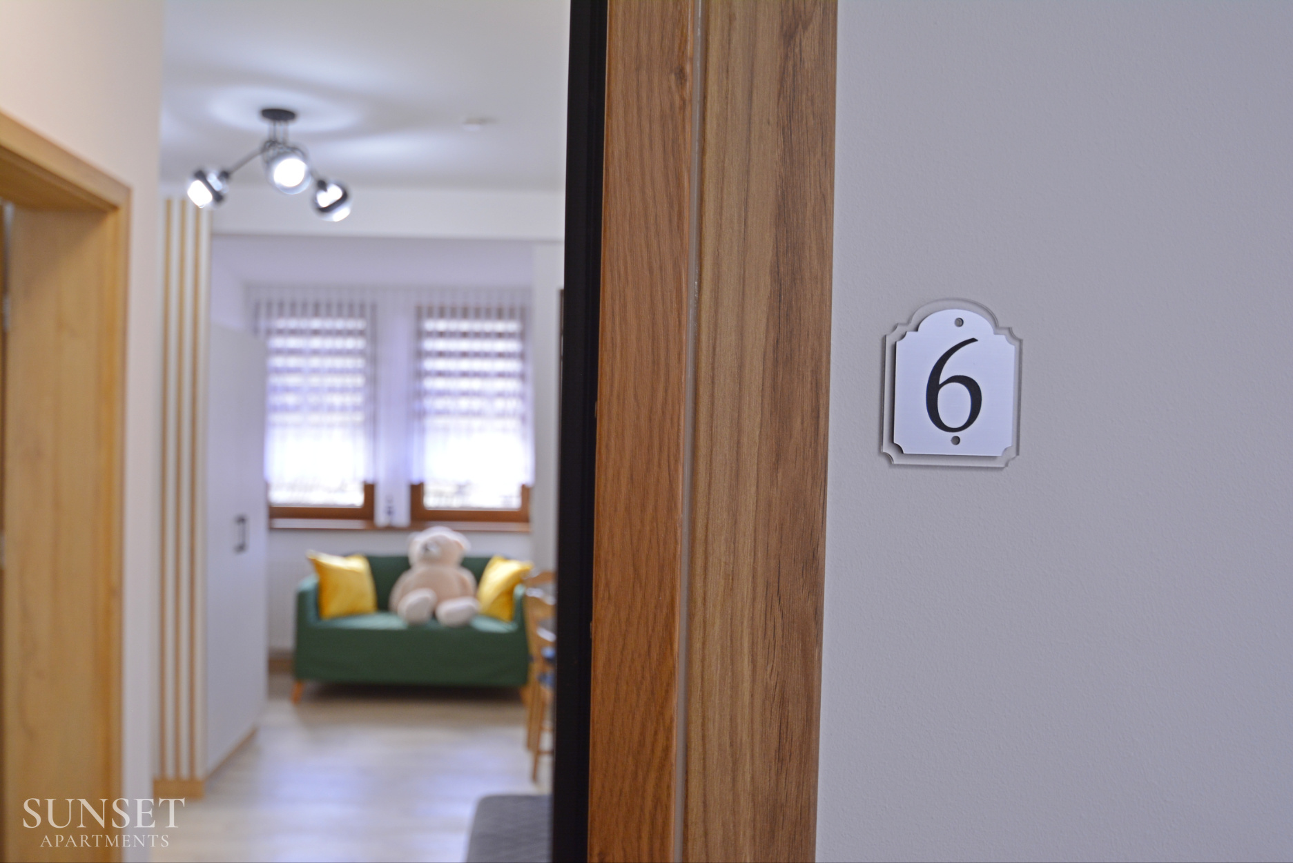 Das Apartment Nr. 6 ist ein ideales Angebot für Familien, ausgelegt für einen Aufenthalt von maximal 4 Personen. Die geräumige Wohnung besteht aus einem Schlafzimmer. Die bequemen Doppelbetten sind 160 cm breit. Das Wohnzimmer ist mit der Küchenzeile verbunden. Das Badezimmer ist mit einer Waschmaschine ausgestattet, die Ihren Aufenthalt noch angenehmer macht. Im Schlafzimmer gibt es einen Fernseher. Das Ganze ist in angenehmen, warmen Farben gehalten. Wohnung Nr. 6 und 5 liegen einander gegenüber. Ein Parkplatz ist im Angebot nicht enthalten.