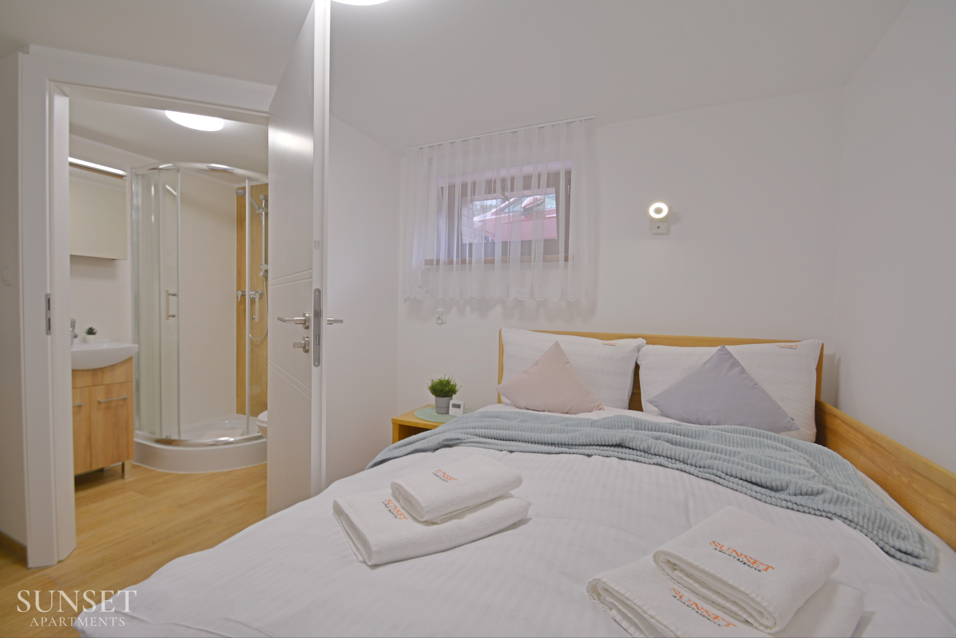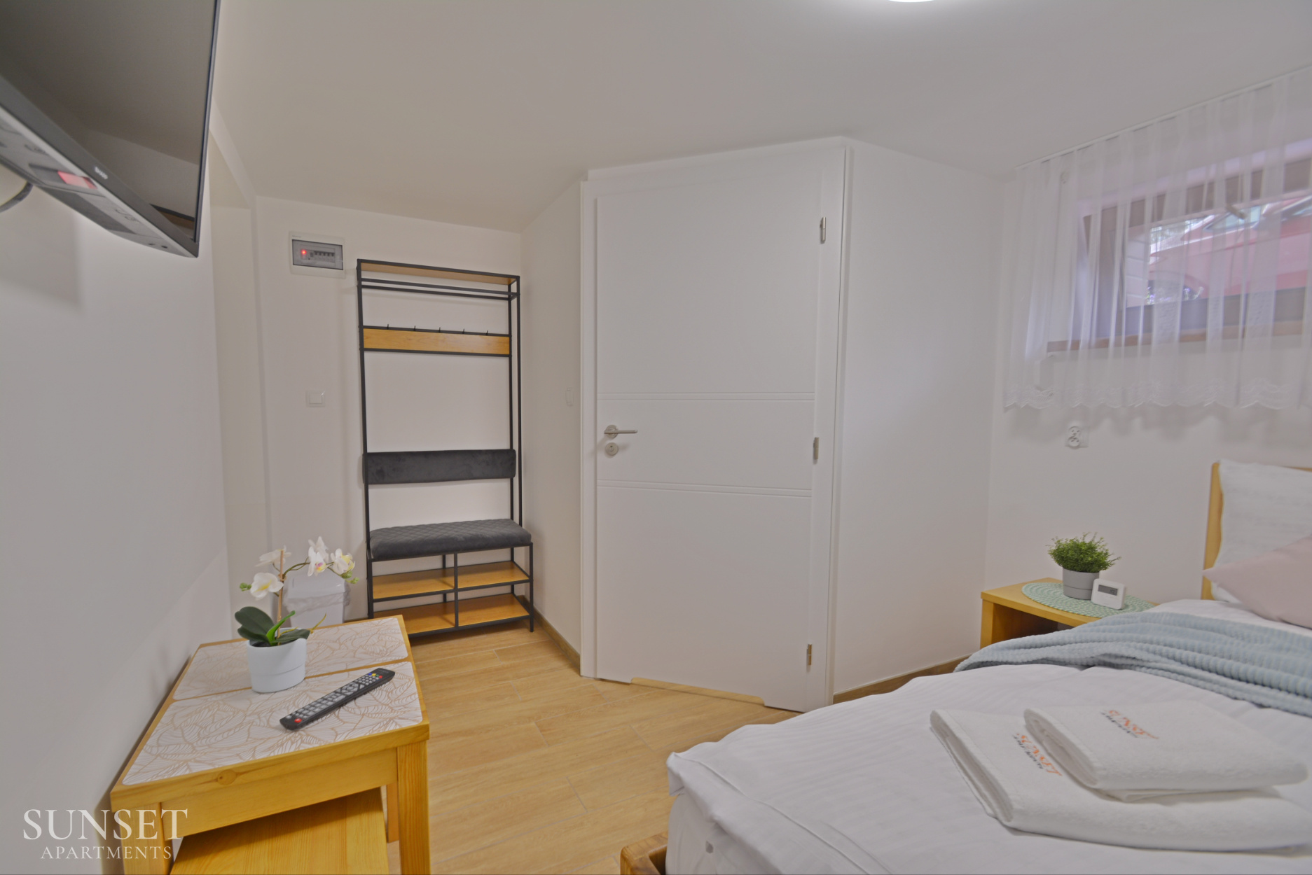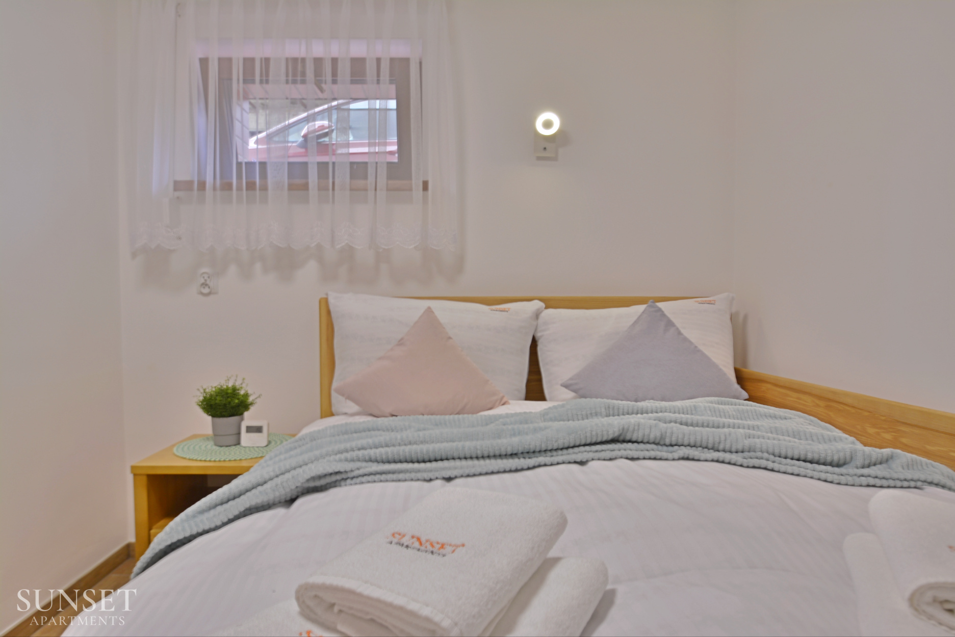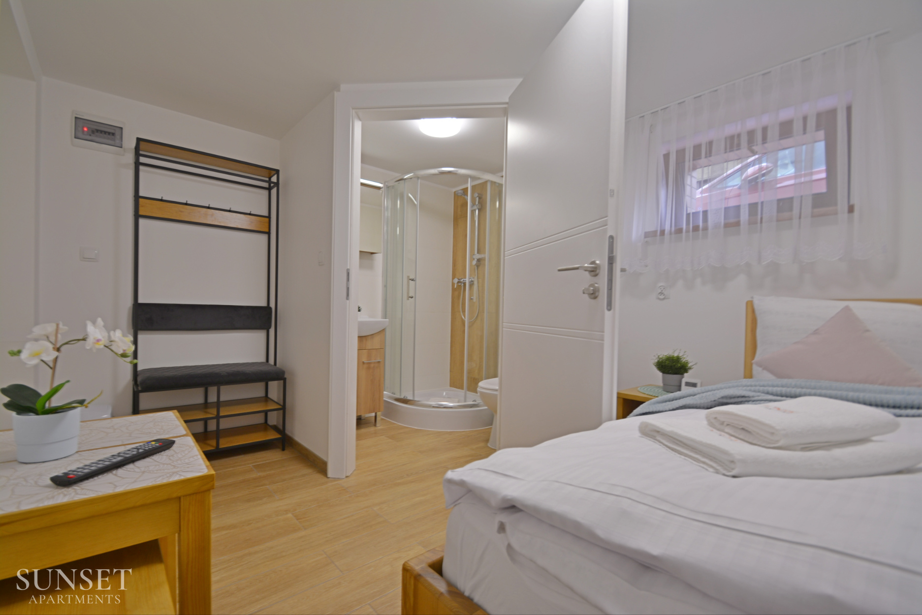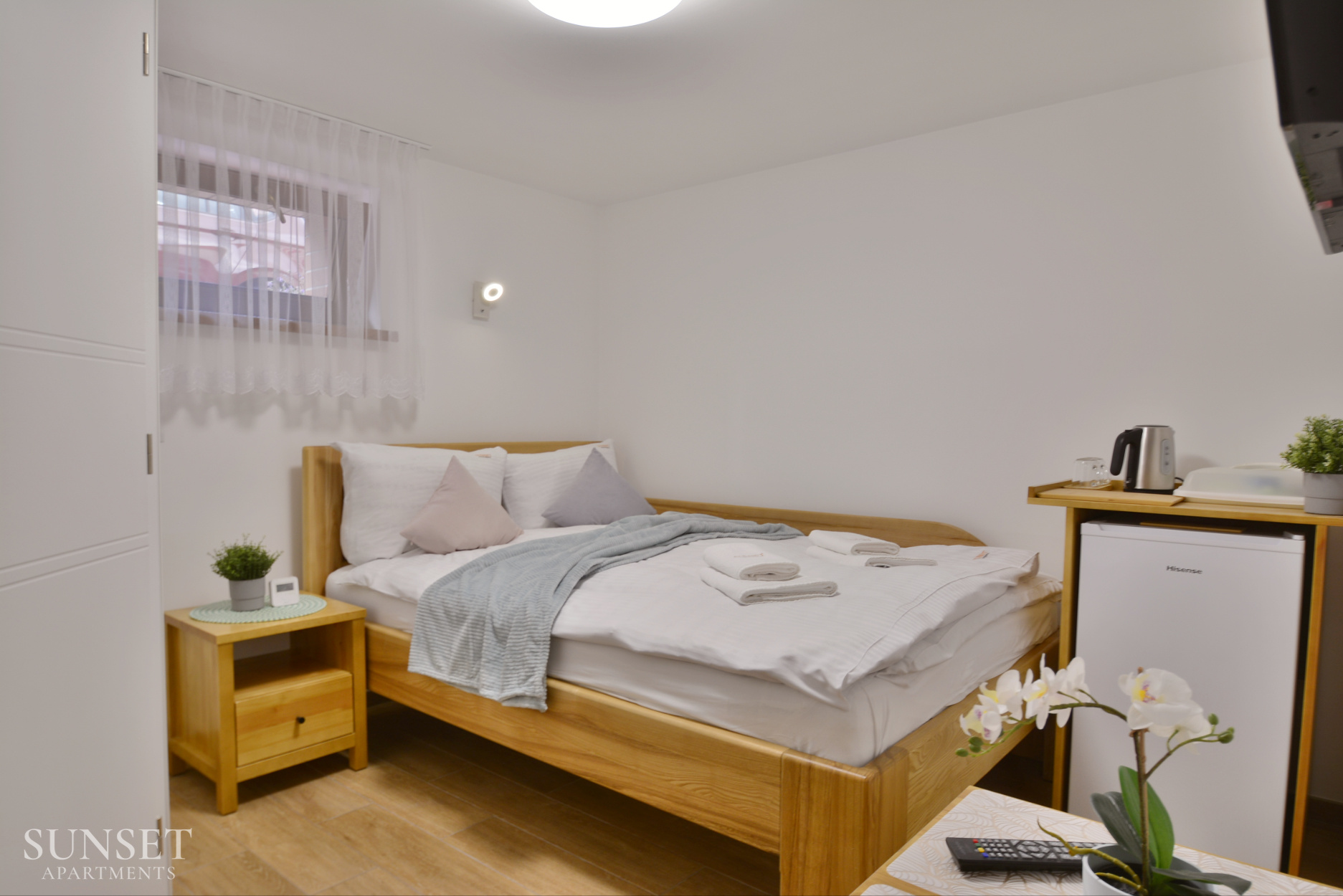 Das Zimmer „01“ im Gebäude Villa „La Mare“ ist ein Angebot für maximal zwei Personen. Es ist mit einem bequemen Doppelbett (160 cm breit), einem Fernseher, einem Kühlschrank, einem Wasserkocher und grundlegenden Utensilien ausgestattet: Besteck, Gläser, Teller und ein Schneidebrett. Im Fenster befindet sich ein Rollo, das den Raum angenehmer macht. Das Zimmer befindet sich auf Ebene -1, neben den Zimmern 02, 03, 04, 05 und 06. Ein Parkplatz ist im Angebot nicht enthalten.