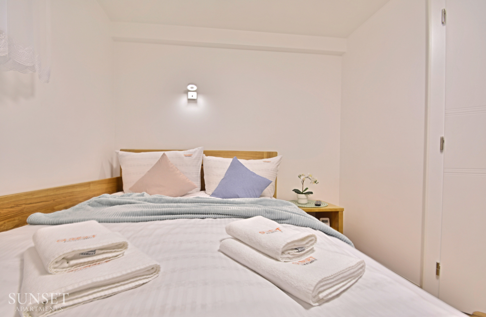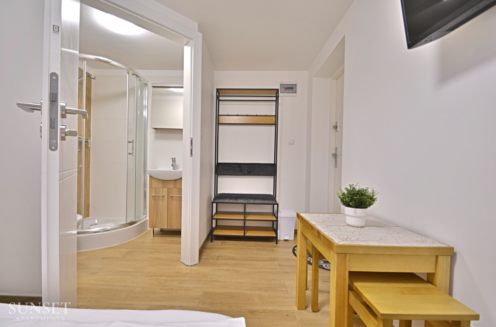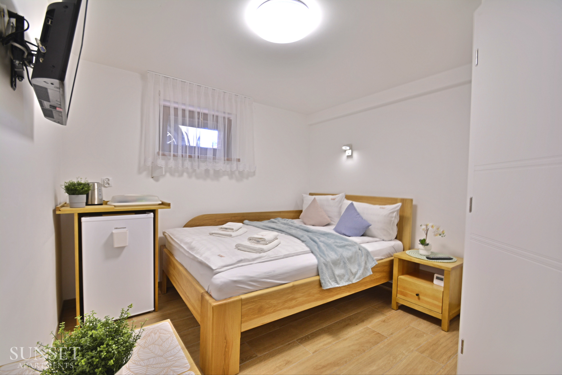 Das Zimmer „06“ im Gebäude Villa „La Mare“ ist ein Angebot für maximal zwei Personen. Es ist mit einem bequemen Doppelbett (160 cm breit), einem Fernseher, einem Kühlschrank, einem Wasserkocher und grundlegenden Utensilien ausgestattet: Besteck, Gläser, Teller und ein Schneidebrett. Im Fenster befindet sich ein Rollo, das den Raum angenehmer macht. Das Zimmer befindet sich auf Ebene -1, neben den Zimmern 01, 02, 03, 04 und 05. Ein Parkplatz ist im Angebot nicht enthalten.